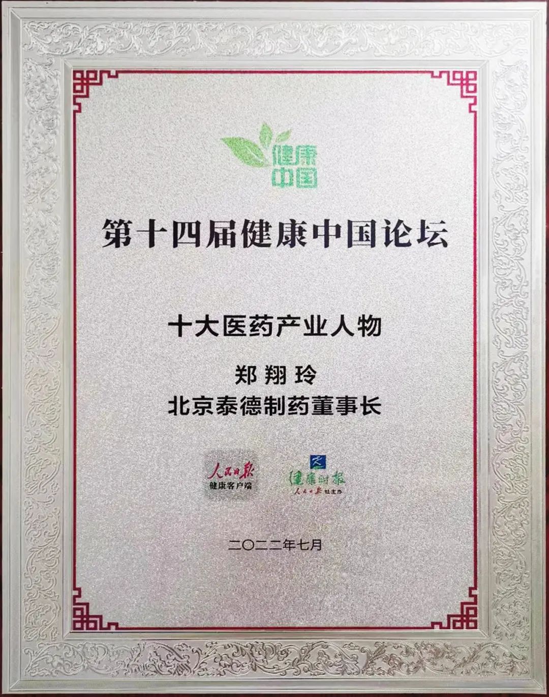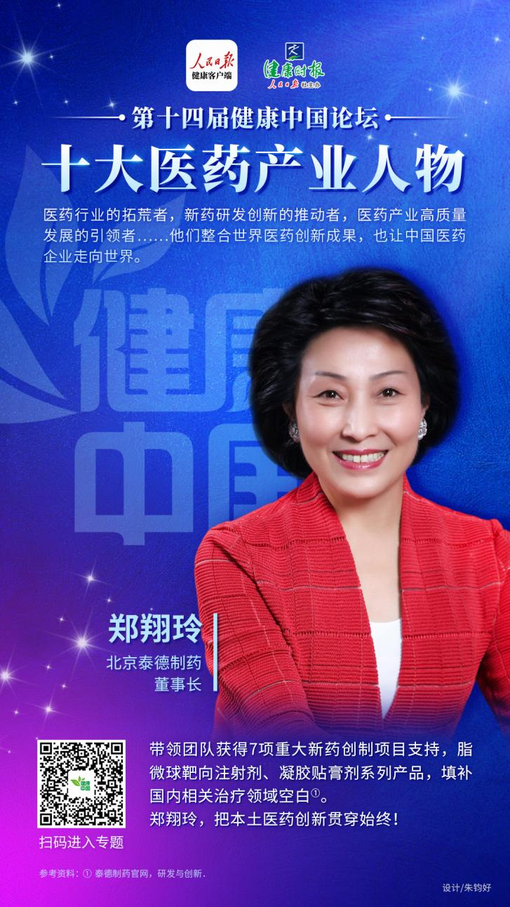 2022年8月3日,第十四屆健康中國論壇•十大醫藥產業人物榜單發布儀式舉行。正大制藥集團總裁、中國生物制藥董事會副主席、北京泰德制藥股份有限公司董事長鄭翔玲女士榮獲“十大醫藥產業人物”榮譽。組委會表示:十位大醫藥產業人物都是醫藥行業的拓荒者,新藥研發創新的推動者,醫藥產業高質量發展的引領者。