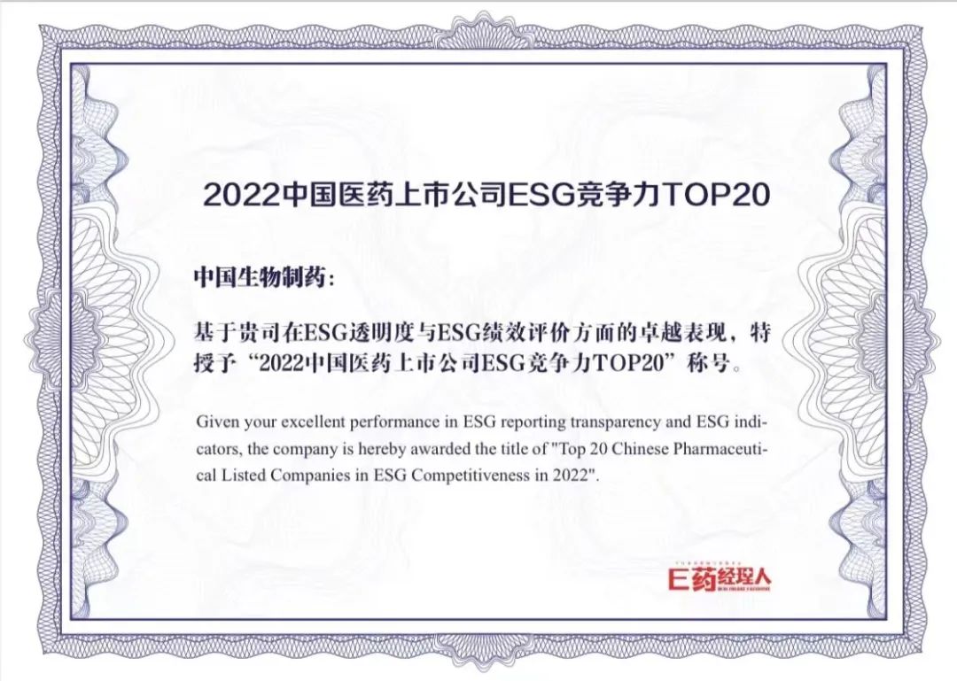 2022年10月14日,知名醫(yī)藥行業(yè)媒體E藥經(jīng)理人與中國(guó)領(lǐng)先的企業(yè)社會(huì)責(zé)任獨(dú)立咨詢機(jī)構(gòu)商道咨詢聯(lián)合發(fā)布了“中國(guó)醫(yī)藥上市公司 ESG 競(jìng)爭(zhēng)力與 ESG 投資價(jià)值榜單”。中國(guó)生物制藥以優(yōu)秀的 ESG 管理表現(xiàn)與卓越的行業(yè)競(jìng)爭(zhēng)力,入選“ 2022 中國(guó)醫(yī)藥上市公司 ESG 競(jìng)爭(zhēng)力 TOP20 榜單”。