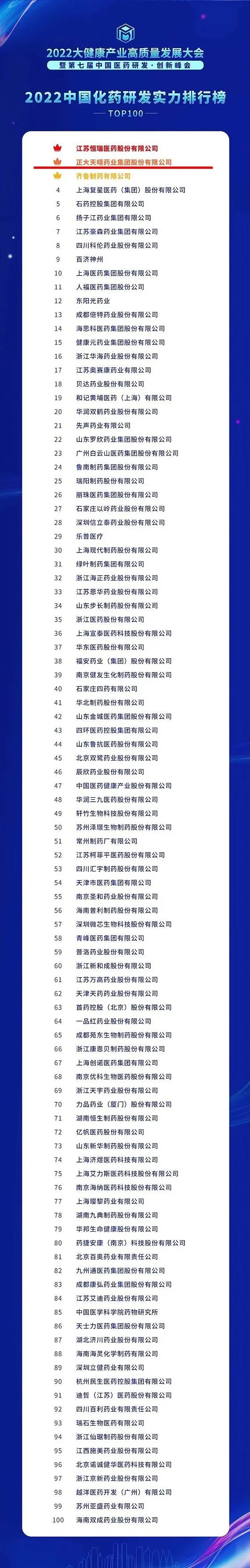 12月9日,“2022中國藥品研發(fā)實力排行榜系列榜單”在“ 2022大健康產(chǎn)業(yè)高質(zhì)量發(fā)展大會暨第七屆中國醫(yī)藥研發(fā)•創(chuàng)新峰會”上隆重發(fā)布。中國生物制藥成員企業(yè)正大天晴榮登 “2022中國藥品研發(fā)綜合實力排行榜TOP100”、“2022中國化藥研發(fā)實力排行榜TOP100” 及 “2022中國生物藥研發(fā)實力排行榜TOP50” 三大榜單,分別位列第二名、第二名及第六名。