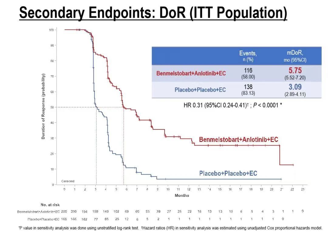 次要終點中兩組ORR對比為81.3% vs 66.8%,中位DoR遠高于對照組,為5.75m vs 3.09m,HR=0.31 (95%Cl 0.24-0.41); p<0.0001。