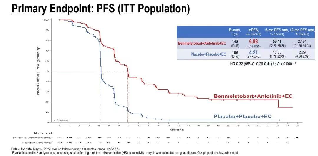 主要終點中,兩組人群中IRC評估的中位PFS存在顯著差異,且為歷史最高值,分別為6.93m vs 4.21m,HR=0.32(95%Cl 0.26-0.41) ; p<0.0001。