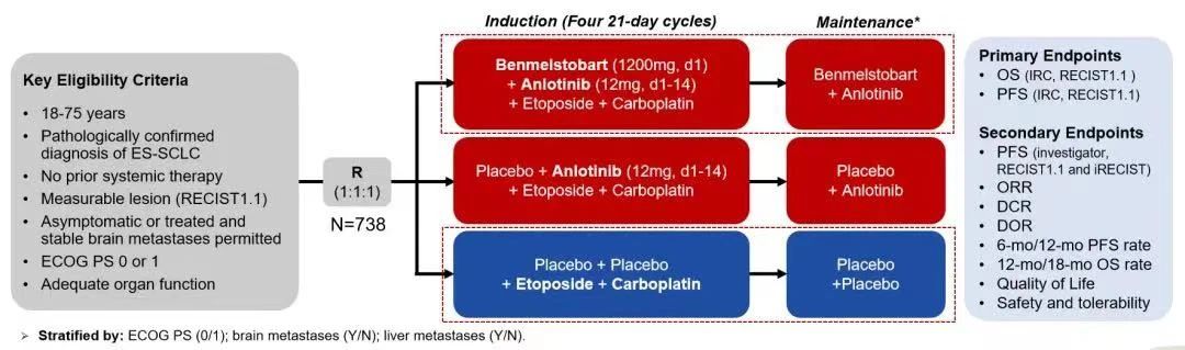 在一項隨機、雙盲、平行對照、多中心III期的ETER701研究臨床中,既往未經系統治療的ES-SCLC患者 1:1:1 隨機分為三組,分別接受貝莫蘇拜單抗+安羅替尼+依托泊苷+卡鉑后采用貝莫蘇拜單抗+安羅替尼維持、接受安慰劑+安羅替尼+依托泊苷+卡鉑后采用安慰劑+安羅替尼維持、接受安慰劑+依托泊苷+卡鉑后采用安慰劑維持。主要終點為獨立影像評估委員會(IRC)評估的總生存期(OS)及無進展生存期(PFS),次要終點包括研究者評估的PFS、客觀緩解率(ORR)、疾病控制率(DCR)、緩解持續時間(DOR)及安全性等。