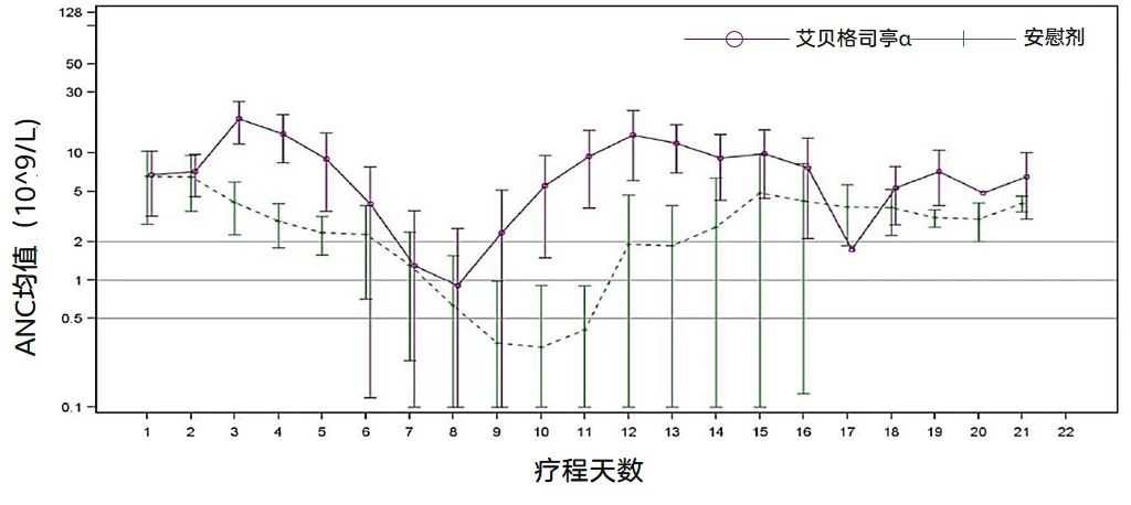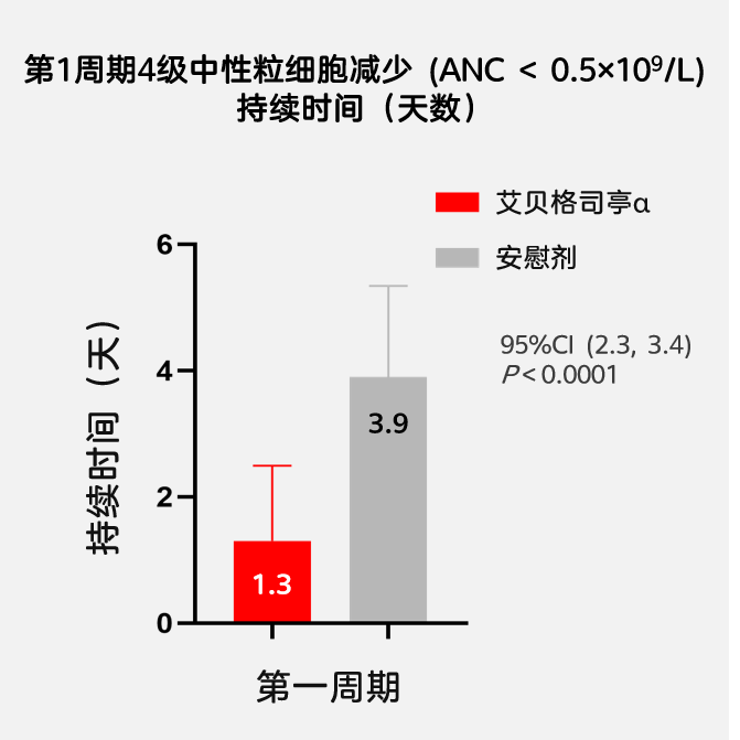 尤其值得注意的是,艾貝格司亭α組在第1周期的中性粒細(xì)胞計數(shù)(ANC)最低點(diǎn)及其恢復(fù)時間方面表現(xiàn)更佳。在第1周期中,艾貝格司亭α組和安慰劑組分別在第8天和第10天達(dá)到ANC最低點(diǎn),ANC最低點(diǎn)的平均中性粒細(xì)胞數(shù)分別為0.7×109/L和0.2×109/L,兩組的比率為3.4(95%CI:2.0, 5.6)(圖4)。而且,在艾貝格司亭α組受試者中觀察到更快的ANC恢復(fù),與安慰劑組從ANC最低點(diǎn)恢復(fù)至2×109/L需要4.1天相比,艾貝格司亭α組的恢復(fù)時間為2.1天,平均差異為 2.0 天(圖4)。