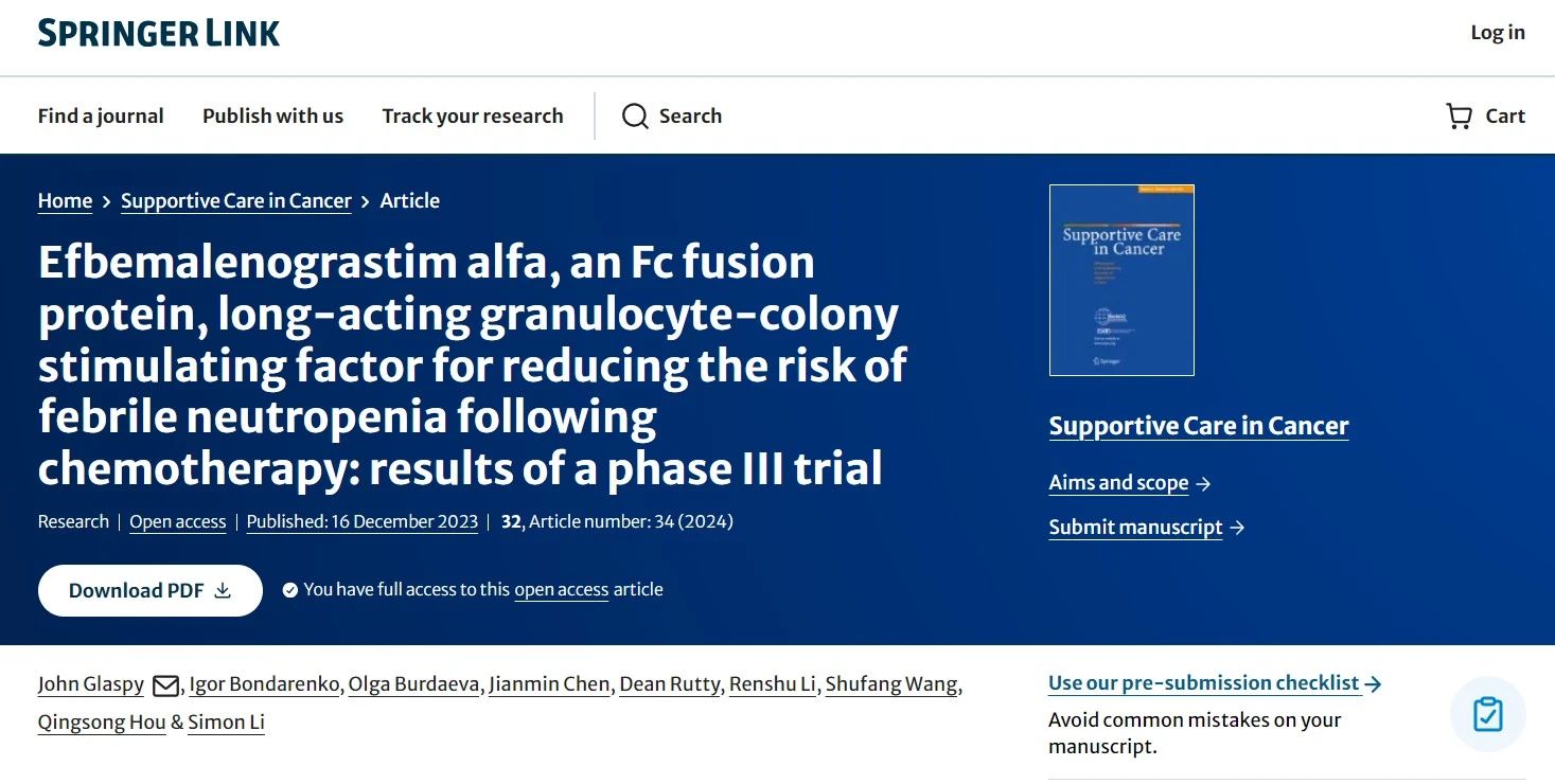 Glaspy J, Bondarenko I, Burdaeva O, et al. Efbemalenograstim alfa, an Fc fusion protein, long-acting granulocyte-colony stimulating factor for reducing the risk of febrile neutropenia following chemotherapy: results of a phase III trial[J]. Supportive Care in Cancer, (2024) 32:34. https://doi.org/10.1007/s00520-023-08176-6.