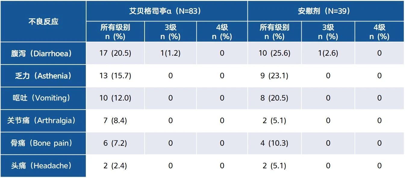 安全性方面,骨痛是與G-CSF相關(guān)的主要不良事件,在艾貝格司亭α組和安慰劑組中分別報告了7.2%和10.3%的受試者發(fā)生了骨痛。所有骨痛均為輕度至中度(表2)。除了來自于化療方案的不良事件(例如惡心、嘔吐、腹瀉、脫發(fā)、疲勞等),本研究未報告其他被認(rèn)為可能歸因于G-CSF及其衍生物的不良事件(如脾破裂、鐮狀細(xì)胞性貧血伴危象、急性呼吸窘迫綜合征等)。