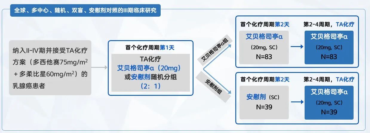 本研究為全球、多中心、隨機(jī)、雙盲、安慰劑對照的III期臨床研究,由加州大學(xué)洛杉磯分校醫(yī)學(xué)院(UCLA School of Medicine)的John Glaspy作為主要研究者,在全球16個中心進(jìn)行。接受4個周期TA方案(75 mg/m2紫杉醇/多西他賽+ 60 mg/m2多柔比星)的II-IV期乳腺癌患者,以2:1的比例(按國家/地區(qū)分層)隨機(jī)分配到艾貝格司亭α組或安慰劑組,在第一個周期化療給藥后約24小時皮下注射20 mg艾貝格司亭α或安慰劑,之后的化療周期所有的受試者均給予艾貝格司亭α。主要有效性終點(diǎn)為首個化療周期內(nèi)觀察到4級(重度)中性粒細(xì)胞減少癥(ANC<0.5×109/L)的持續(xù)時間。