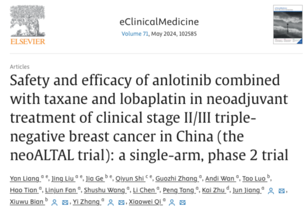 [1] Liang Y, Qi X, et al. Safety and efficacy of anlotinib combined with taxane and lobaplatin in neoadjuvant treatment of clinical stage II/III triple-negative breast cancer in China (the neoALTAL trial): a single-arm, phase 2 trial. EClinicalMedicine. 2024;71:102585.