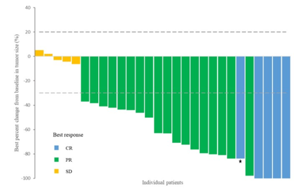 圖1. 靶病灶最佳療效(安羅替尼聯(lián)合貝莫蘇拜單抗治療肉瘤的研究數(shù)據(jù))