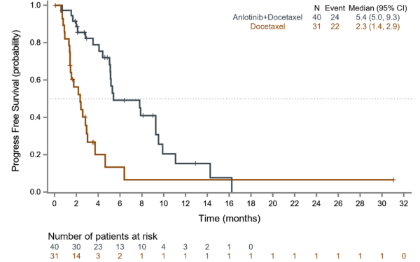 圖2. 患者無進(jìn)展生存期曲線(安羅替尼聯(lián)合多西他賽對(duì)比多西他賽治療免疫經(jīng)治非小細(xì)胞肺癌的研究數(shù)據(jù))