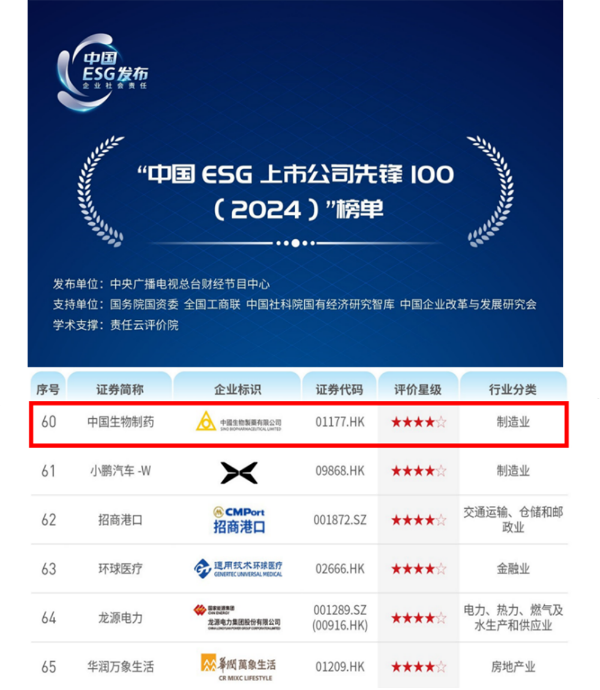 央視“中國ESG上市公司先鋒100”榜單發(fā)布 中國生物制藥再度入選