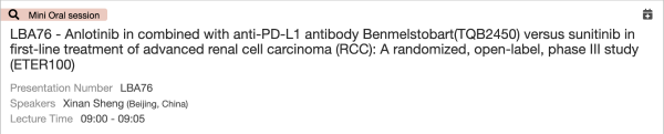 此前,國家藥品監督管理局藥品審評中心(CDE)官網顯示,安羅替尼聯合貝莫蘇拜單抗用于一線治療晚期不可切除或轉移性腎細胞癌的新適應癥上市申請已獲受理,這是鹽酸安羅替尼膠囊申報上市的第八個適應癥,是貝莫蘇拜單抗注射液申報上市的第三個適應癥。LBA是ESMO科學委員會從海量稿件中篩選的高質量、高水平、有望改變腫瘤領域臨床實踐或闡述疾病重要機制的隨機II、III期研究成果。安羅替尼聯合貝莫蘇拜單抗有望延長腎細胞癌患者的生存獲益,成為晚期腎細胞癌新的一線標準治療方案。