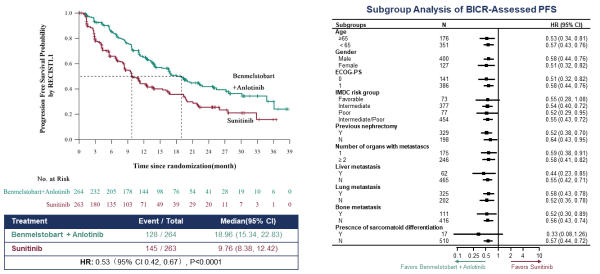 ETER100最新研究數據[11]顯示,安羅替尼聯合貝莫蘇拜單抗組(下稱試驗組)和對照組的中位PFS分別為18.96個月和9.76個月,試驗組顯著延長了患者的PFS(圖1左)。大部分亞組顯示可從安羅替尼聯合貝莫蘇拜單抗治療中獲得顯著PFS獲益(圖1右)。提示安羅替尼聯合莫蘇拜單抗有望在臨床上延長腎細胞癌患者的生存獲益。
