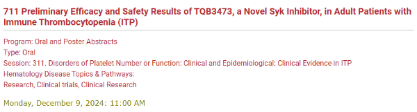 SYK 抑制劑TQB3473首次公布原發(fā)免疫性血小板減少癥研究數(shù)據(jù)