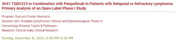 [5] Qingqing Cai,et al.TQB2223 in Combination with Penpulimab in Patients with Relapsed or Refractory Lymphoma: Primary Analysis of an Open-Label Phase I Study.2024 ASH.
