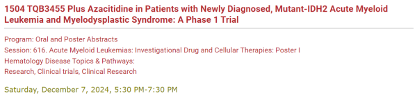 [6] Wenbing Duan,et al.TQB3455 Plus Azacitidine in Patients with Newly Diagnosed, Mutant-IDH2 Acute Myeloid Leukemia and Myelodysplastic Syndrome: A Phase 1 Trial.2024 ASH.