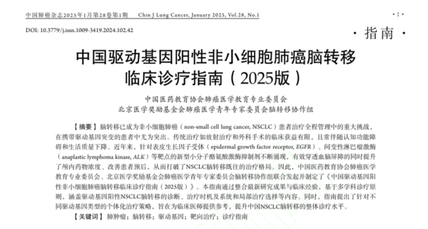 1. 中國驅(qū)動基因陽性非小細(xì)胞肺癌腦轉(zhuǎn)移臨床診療指南(2025版). 中國肺癌雜志. 2025; 28(1): 1-21
