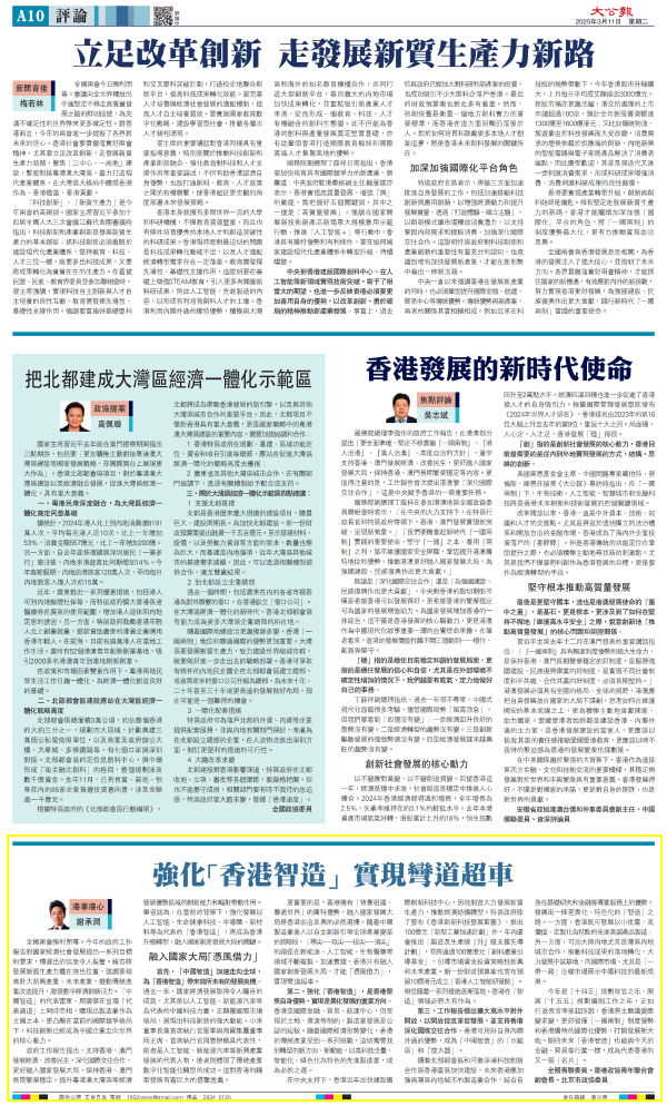 在中央支持下,香港近年加快建設國際創新科技中心,因地制宜大力發展新質生產力,推動經濟結構轉型。特區政府除了發布《香港創新科技發展藍圖》、推出100億元“新型工業加速計劃”外,年內還會推出“制造及生產線‘升’級支援先導計劃”,并將通過100億港元“創科產業引導基金”,引導市場資金投資策略性新興和未來產業。新一份財政預算案也宣布預留10億港元成立“香港人工智能研發院”。相信隨著一系列措施逐漸落地,香港在“智造”領域必將大有作為。