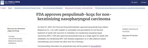 本次兩項適應癥在美國同時獲批,主要基于AK105-304和AK105-202兩項關鍵注冊研究。其中,AK105-304研究是一項納入了全球不同種族鼻咽癌患者的隨機、雙盲、國際多中心Ⅲ期注冊性臨床試驗。研究結果顯示,派安普利單抗聯合化療在復發或轉移性NPC患者的一線治療中展現出具有統計學意義和臨床意義的顯著無疾病進展生存獲益,且具有優異的安全性。AK105-304研究數據將在2025年美國癌癥協會年會(AACR)上以口頭報告(Oral)的形式發布。