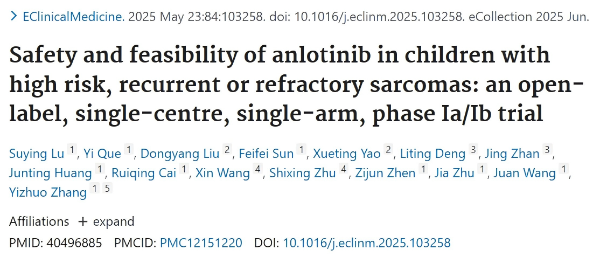 [1]Lu S, Que Y, Liu D, Sun F , Yao X, Deng L, Zhan Ji , Huang J, Cai R, Wang X, Zhu S, Zhen Z, Zhu J , Wang J, Zhang Y, Safety and feasibility of anlotinib in children with high risk, recurrent or refractory sarcomas: an open-label, single-centre, single-arm, phase Ia/Ib trial,eClinicalMedicine 2025 June;84: 103258.