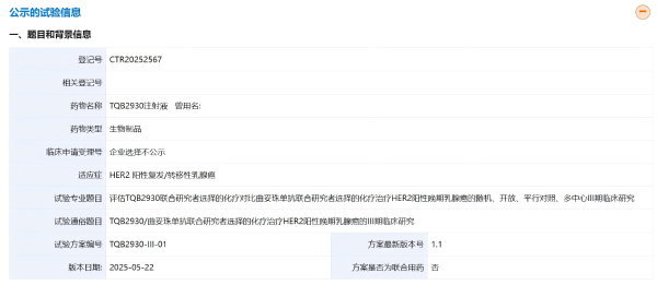 此次登記的是一項隨機、開放、平行對照、多中心Ⅲ期臨床研究,旨在評估TQB2930聯合研究者選擇的化療對比曲妥珠單抗聯合研究者選擇的化療治療 HER2 陽性晚期乳腺癌的有效性和安全性。本研究擬入組416人,主要終點是通過獨立評審委員會(IRC)評估的無進展生存期(PFS);次要終點指標包括通過研究者評估的PFS、研究者及IRC評估的緩解持續時間(DOR)、客觀緩解率(ORR)、疾病控制率(DCR)、臨床獲益率(CBR)、總生存期(OS)等。