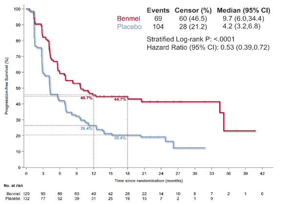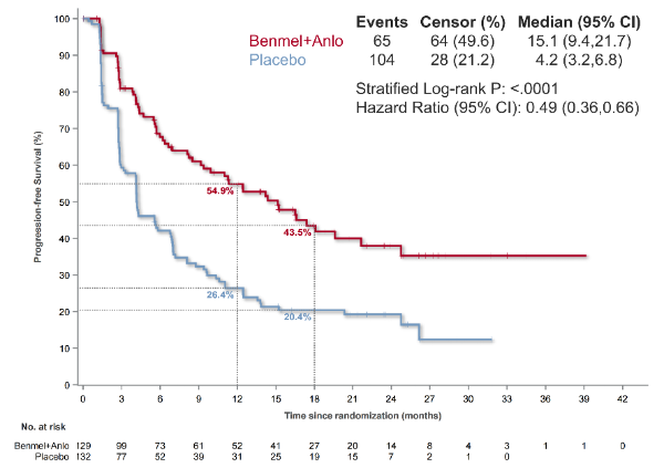 試驗組1:中位PFS 為15.1個月,對照組4.2個月(HR=0.49, 95%CI 0.36-0.66, P<0.001),疾病進展或死亡風險降低51%。