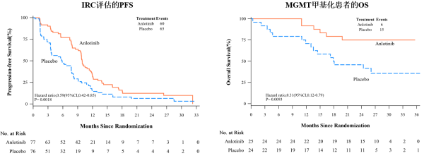 ●有效性方面:安羅替尼組獨立數據委員會(IRC)評估的中位無進展生存期(mPFS)達9.89個月(95% CI 9.10-11.56),較安慰劑組(5.85個月)顯著提升,疾病進展或死亡風險降低41%(HR=0.59,p=0.0018)。值得關注的是,對于MGMT甲基化患者群體,安羅替尼組mOS雖然尚未達到,但相較于安慰劑組,死亡風險已顯著降低69%(HR=0.31,p=0.0093)。