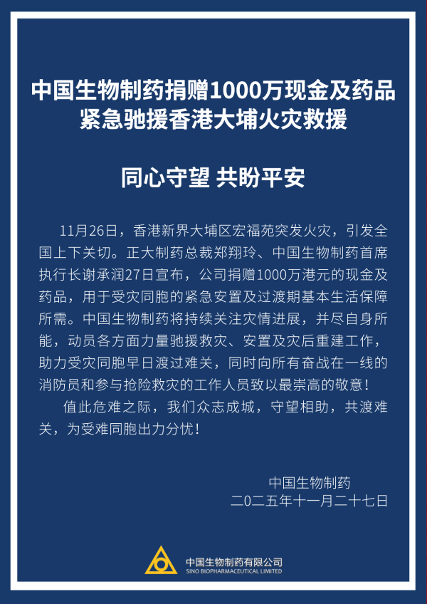 中國生物制藥捐贈1000萬現金及藥品 緊急馳援香港大埔火災救援