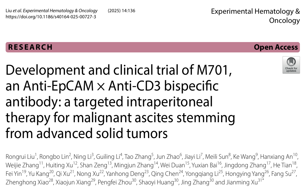 [2]Rongrui Liu, Rongbo Lin, Ning Li,et al.Development and clinical trial of M701, an Anti-EpCAM×Anti-CD3 bispecific antibody: a targeted intraperitoneal therapy for malignant ascites stemming from advanced solid tumors. Exp Hematol Oncol 14,136(2025).
