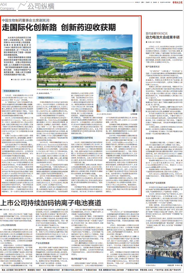 近一個多月以來,中國生物制藥迎來了國家一類創新藥的密集收獲期。中國生物制藥董事會主席謝其潤近日在接受中國證券報記者專訪時表示,這是公司堅持科技創新、以人民健康為中心的結果。公司將繼續加速差異化創新、國際化創新,為推動中國醫藥產業高質量發展、構建人類衛生健康共同體貢獻更多中國力量。她同時指出,創新和國際化需要年輕人的活力,“希望中國生物制藥能夠吸引行業中最出色的年輕人加盟,攜起手來共同打造中國的跨國藥企。”6月12日,中國證券報A04版刊登了此篇報道。