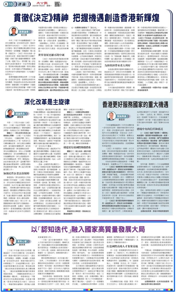 一方面,這次全會明確教育、科技、人才是中國式現代化的基礎性、戰略性支撐,并提出構建支持全面創新體制機制,對于香港而言,同樣應該以改革促創新,以“空杯心態”迎接新一輪科技革命和產業變革,以“認知迭代”發展新質生產力,提升國際競爭力。